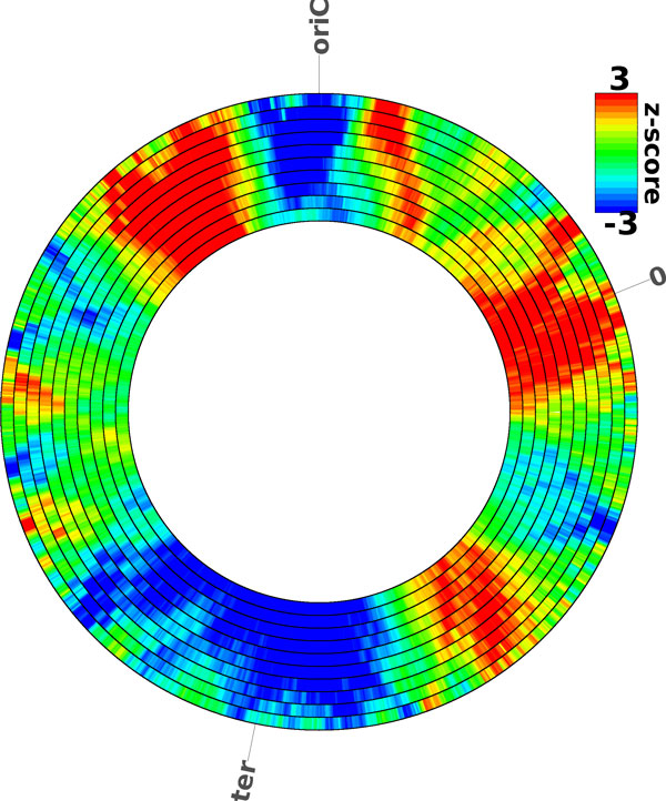 The motif distribution (Figure 1) is color-coded as indicated by the legend on the right. A z-score of 2/-2 is commonly accepted as a significant value. The different rings show the distribution using various window sizes for the calculation of the z-scores ranging from 500 kb at the inner ring to 50kb on the outer ring increasing in 50kb steps. The larger the window size the coarser grained is the analysis of the distribution. On the other hand a coarse grained analysis reveals larger regions with increased/decreased amounts of motifs. For smaller replicons between 50 and 500 kbp the window sizes range from 5 to 50 kbp in 5 kbp steps. DistAMo provides 5 figures to distinguish strands. The strand unspecific figure takes into account all motifs irrespective of the strand. In case of palindromic sequences only the motif on one strand is counted in the statistics. The other four figures take into account motifs on the leading-, lagging-, coding- and template strand separately. DistAMo, in addition, provides a list of genes that are significantly overrepresented/ underrepresented exceeding a z-score of 2/-2. The localizations of respective genes are also visualized on the chromosome in a separate figure.